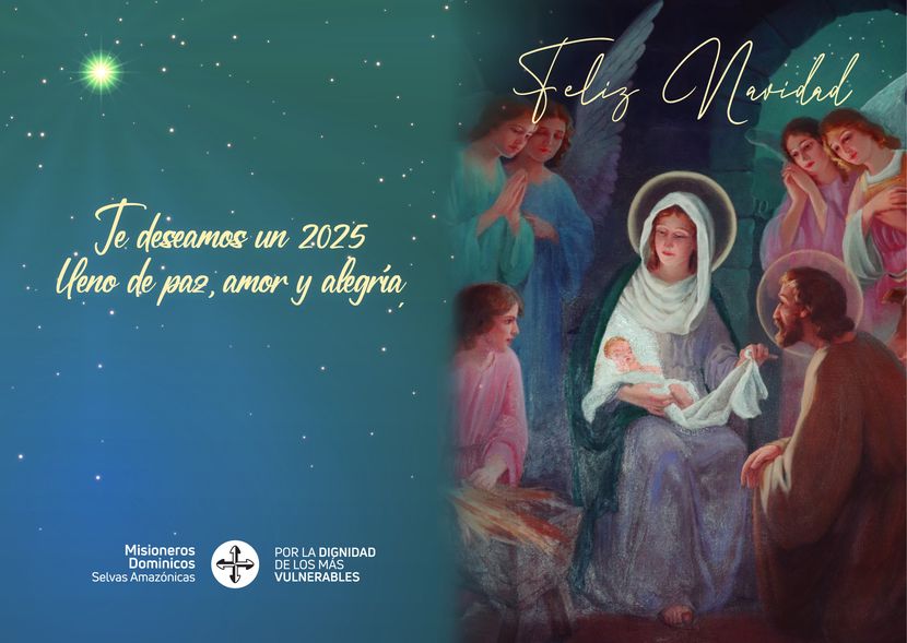 En Misioneros Dominicos Selvas Amazónicas constantemente recordamos y agradecemos tu colaboración, que contribuye a la felicidad y la paz de aquellos más vulnerables a los que evangelizan y promueven los misioneros con tu ayuda. No tienes más que ver la sonrisa de felicidad que nos dedica Arisleidi en la tarjeta y en el calendario, mientras sostiene en brazos a su hija Aísha. Y si recorres las imágenes de cada mes en el calendario, verás otras manifestaciones de felicidad y paz en la celebración comunitaria de la fe, en el estudio, en la expresión musical, en el juego infantil, en la contemplación de la naturaleza. Son todas imágenes del día a día en las misiones que reciben tu ayuda. Qué mejor calendario que el que nos recuerda que el Dios que nace nos invita a amar a todos, en especial a los más pequeños.
